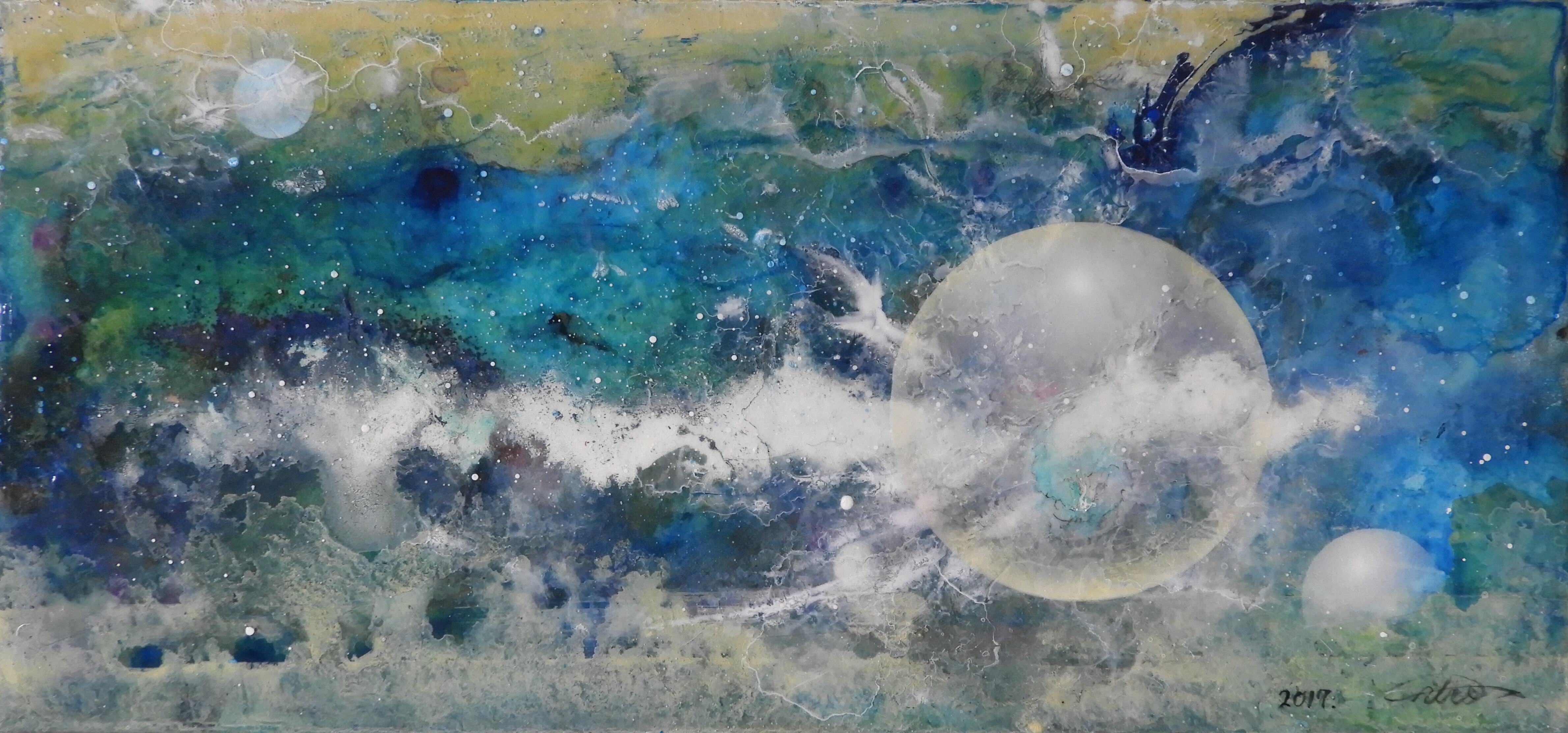 『球体』に魅せられて、独特の技法で『宇宙観』を描いたアート(アクリル画)です。