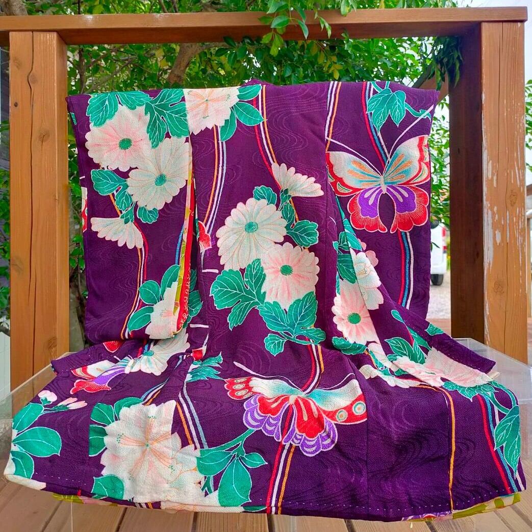 優雅な濃紫(こきむらさき)の地に、大輪の菊や撫子(なでしこ)のような草花と、優美な蝶が大胆に描かれた、一点物のミニチュア着物です。
