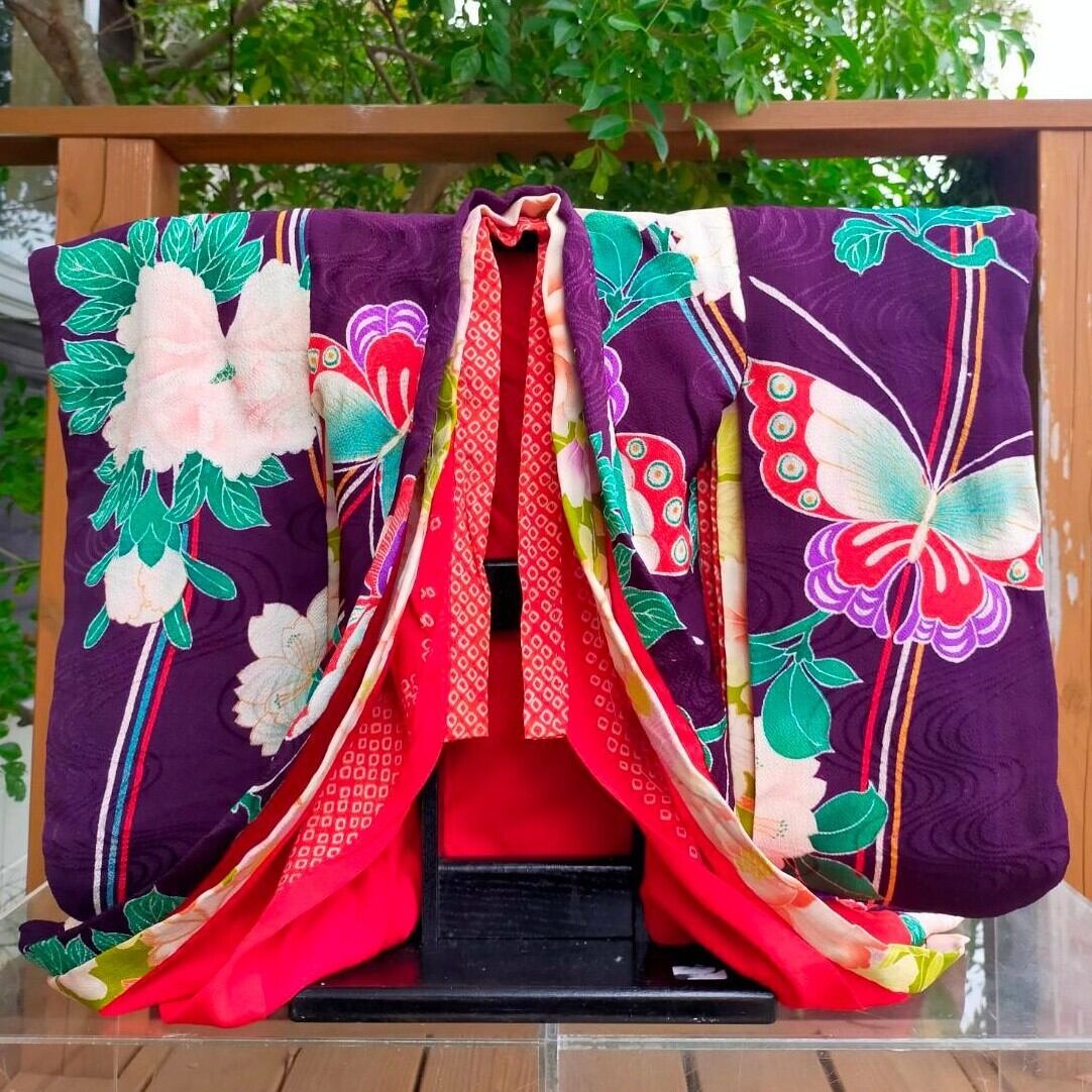 希少な古布(シルク100%)を使用し、裏地の鮮やかな赤色が着物の美しさを際立たせています。