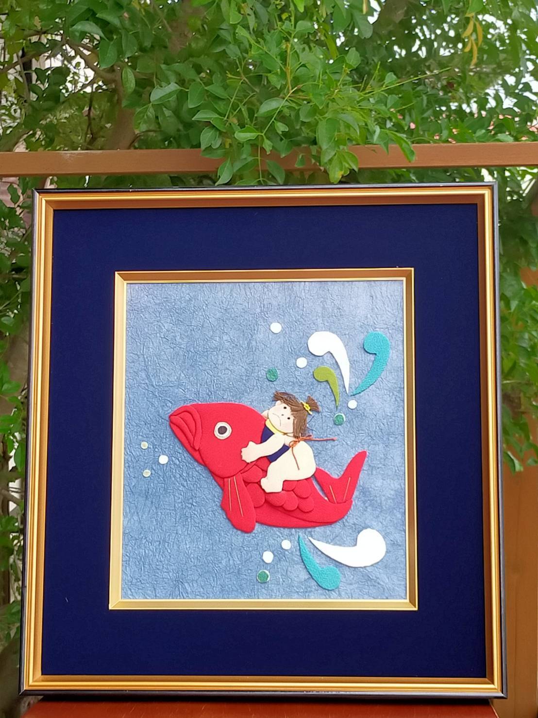 こちらは、日本の伝統的な押し絵の技法を用いて、愛らしい鯉と童の情景を表現した一点物の壁掛です。