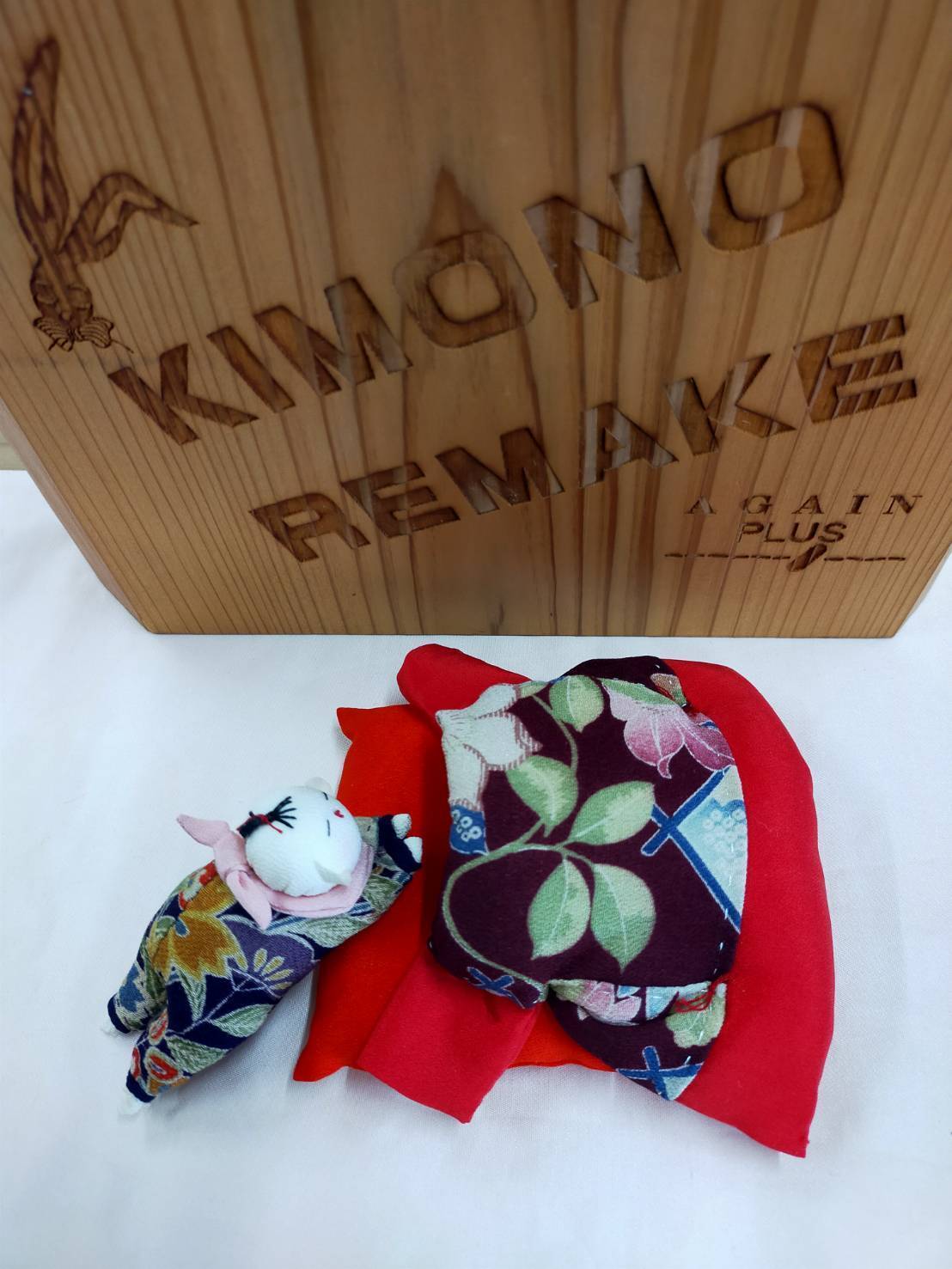 古い着物や布の風合いを活かし、一点一点丁寧に手作りされています。人形は、どてら風の衣装をまとい、ふっくらとしたお布団に包まれて眠っているような愛らしい姿です。