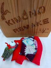 古い着物や布の風合いを活かし、一点一点丁寧に手作りされています。人形は、どてら風の衣装をまとい、ふっくらとしたお布団に包まれて眠っているような愛らしい姿です。