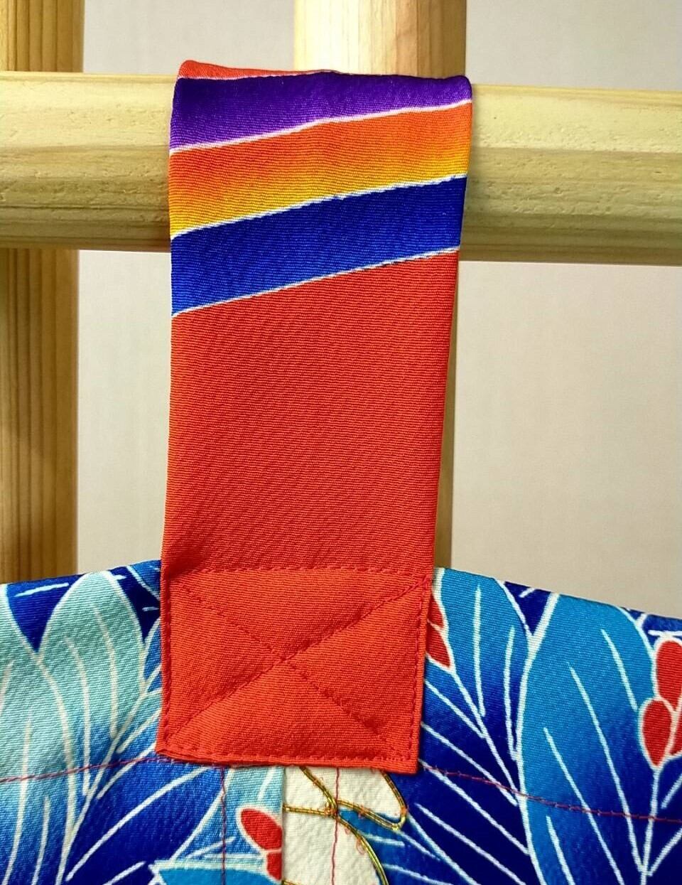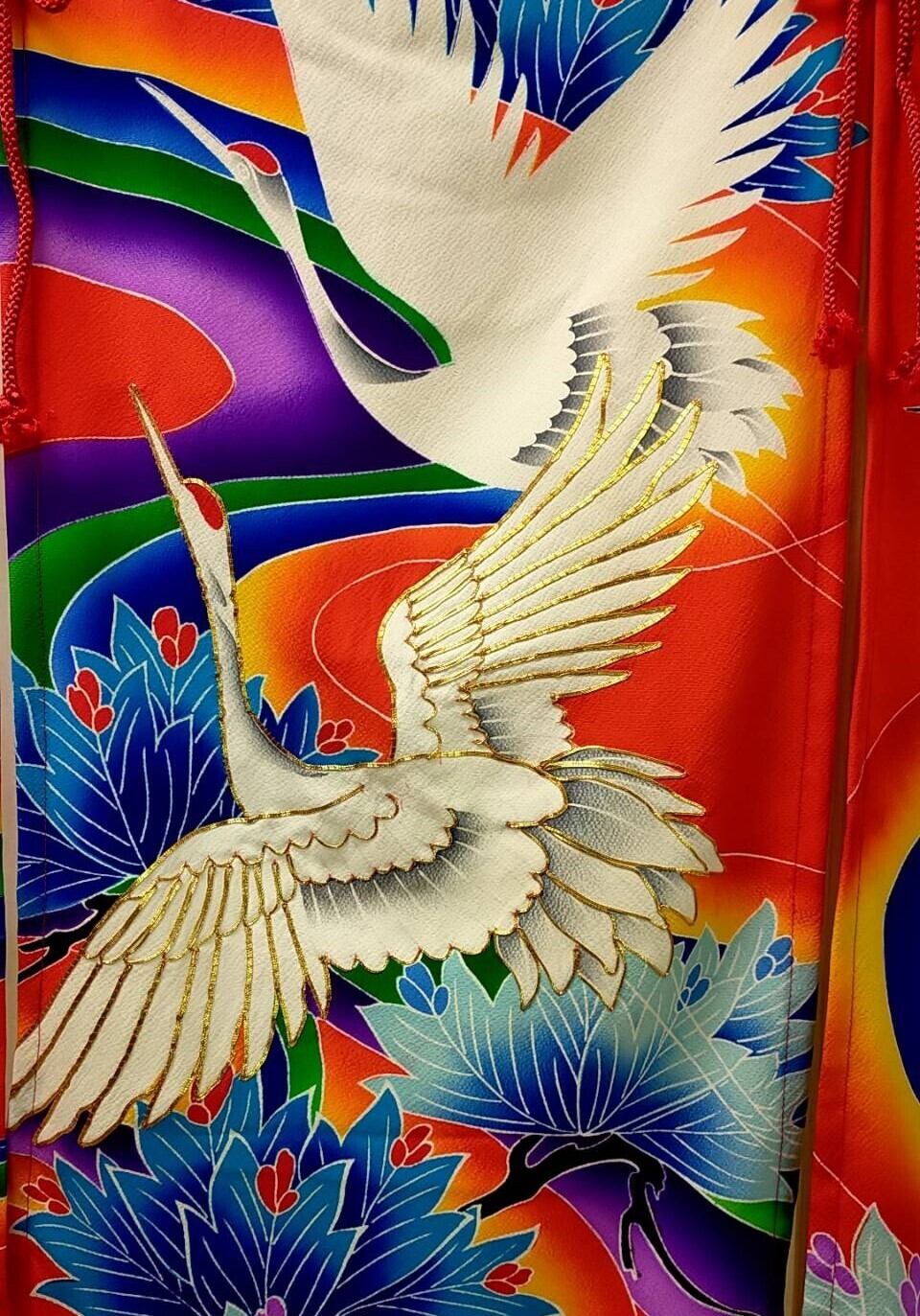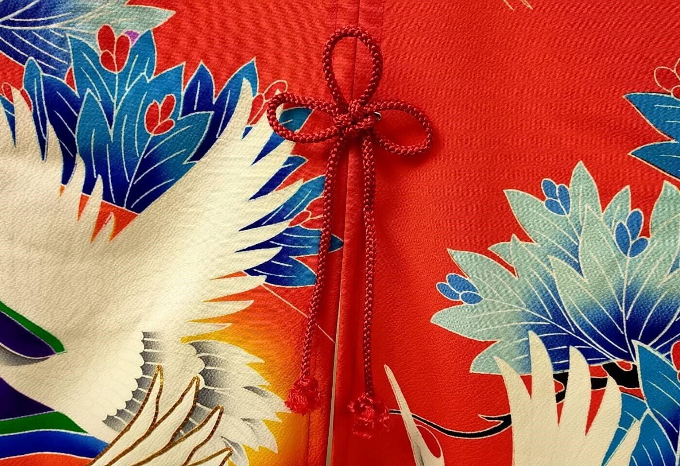 長寿や幸福の象徴の鶴模様が華やかなデザインで、縁起の良い几帳結び飾りは取り外しできるようにピン留めしています。