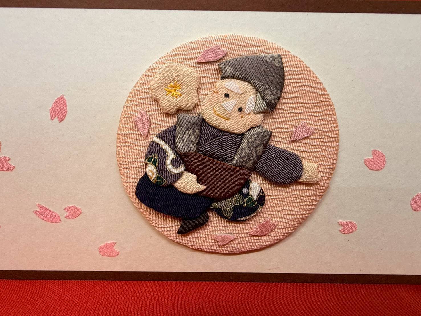 ふっくらとした立体感が魅力の押絵で、物語のクライマックスである「花を咲かせるシーン」を生き生きと表現しました。灰をまくおじいさんの柔らかな表情や、枯れ木に爛漫と咲き誇る桜の花びらなど、熟練の職人技が光る仕上がりです。